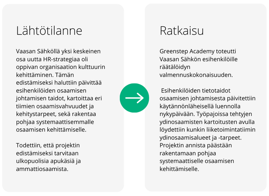Vaasan sähkö on jo yli 130 vuotta energia-alalla toiminut, noin 140 asiantuntijan työpaikka Vaasan sydämessä. Yritys haluaa panostaa vahvasti parhaan asiakaskokemuksen tarjoamiseen ja näin ollen myös erinomaiseen henkilöstöjohtamiseen ja henkilöstön osaamisen kehittämiseen. Keväällä 2023 Vaasan Sähkö kehitti esihenkilöidensä osaamisen johtamisen taitoja Greenstep Academyn valmennuskokonaisuuden avulla.