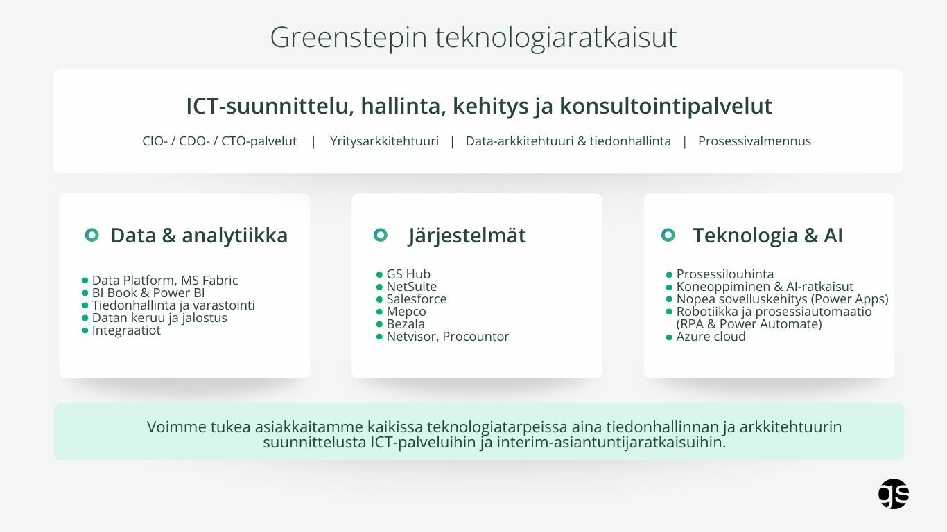 Olipa kyse mistä tahansa palvelustamme – palkanlaskennasta, kirjanpidosta, HR:sta, vastuullisuudesta, analytiikasta – teknologia on aina toimintamme ytimessä. Yli 100 teknologiaosaajamme ansiosta Greenstep on luotettava ja innovatiivinen teknologiakumppani yrityksellesi.