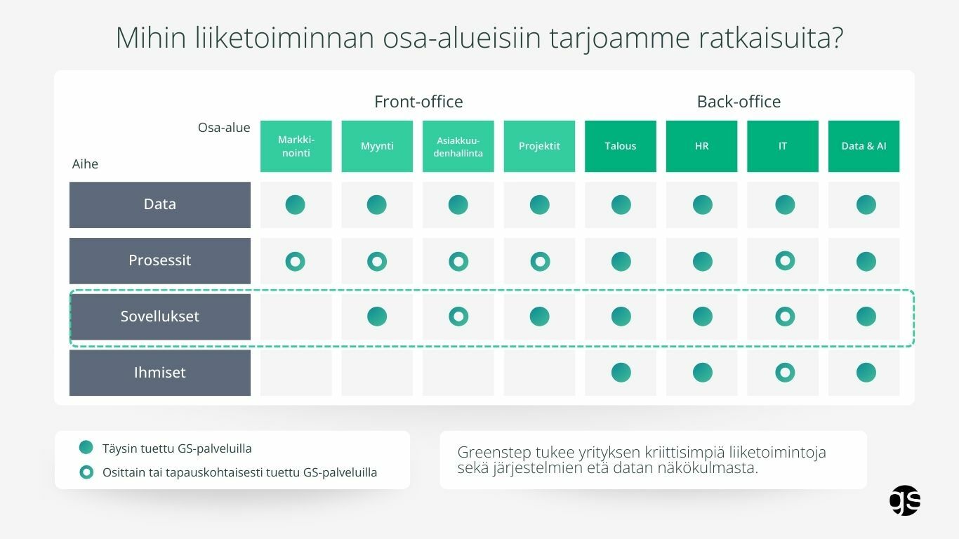 Greenstep panostaa vahvasti teknologisiin ratkaisuihin ja tuotekehitykseen. Hyödynnämme markkinoiden johtavia sovelluksia, kuten NetSuitea, Salesforcea ja Procountoria, mutta kehitämme myös omia ratkaisuja, jotka tukevat asiakkaidemme liiketoimintaa parhaalla mahdollisella tavalla.