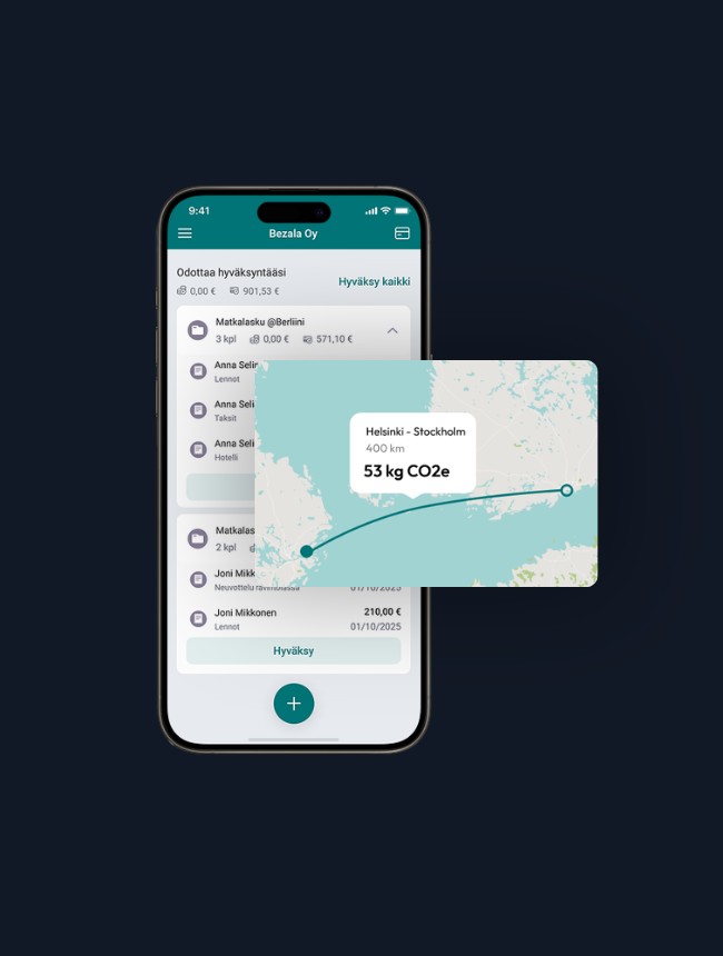 Bezala on matka- ja kululaskusovelluksemme, joka laskee automaattisesti kaikki sovellukseen lisättyjen matkakulujen päästöt – ilman lisäveloitusta.